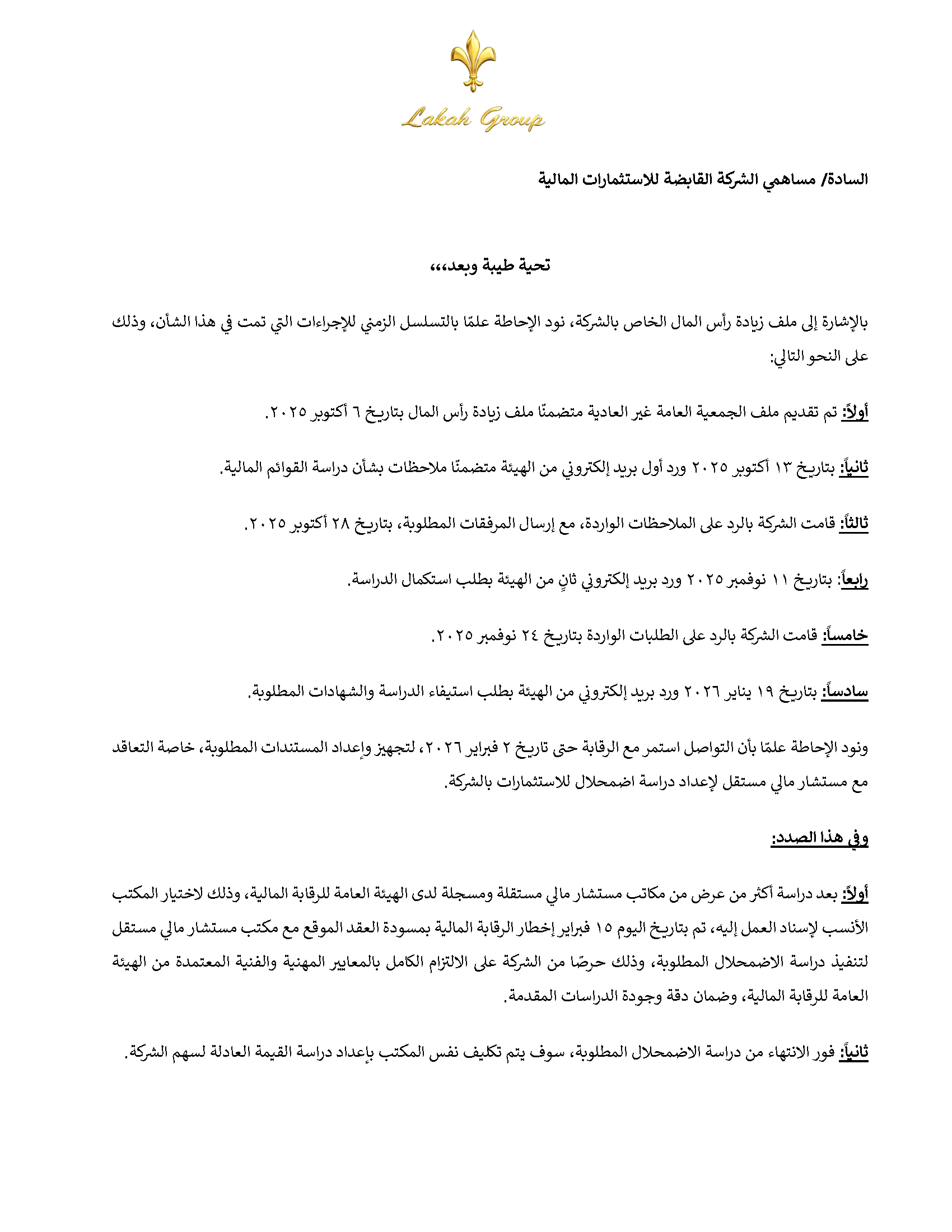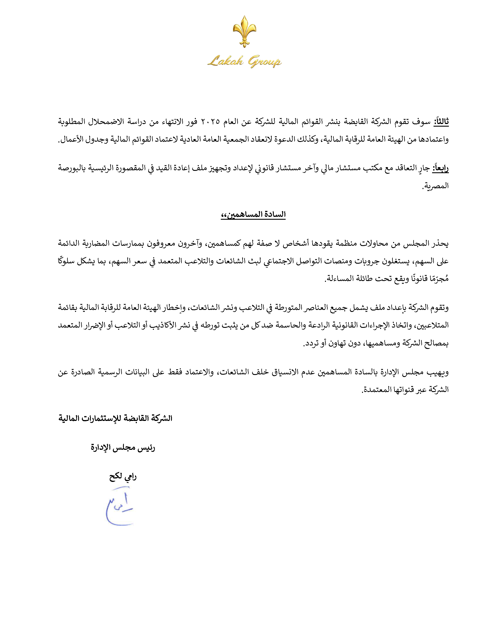 رئيس مجلس إدارة القابضة للاستثمارات المالية يدعو الجمعية الغير العادية ( اجتماع ثاني) للانعقاد